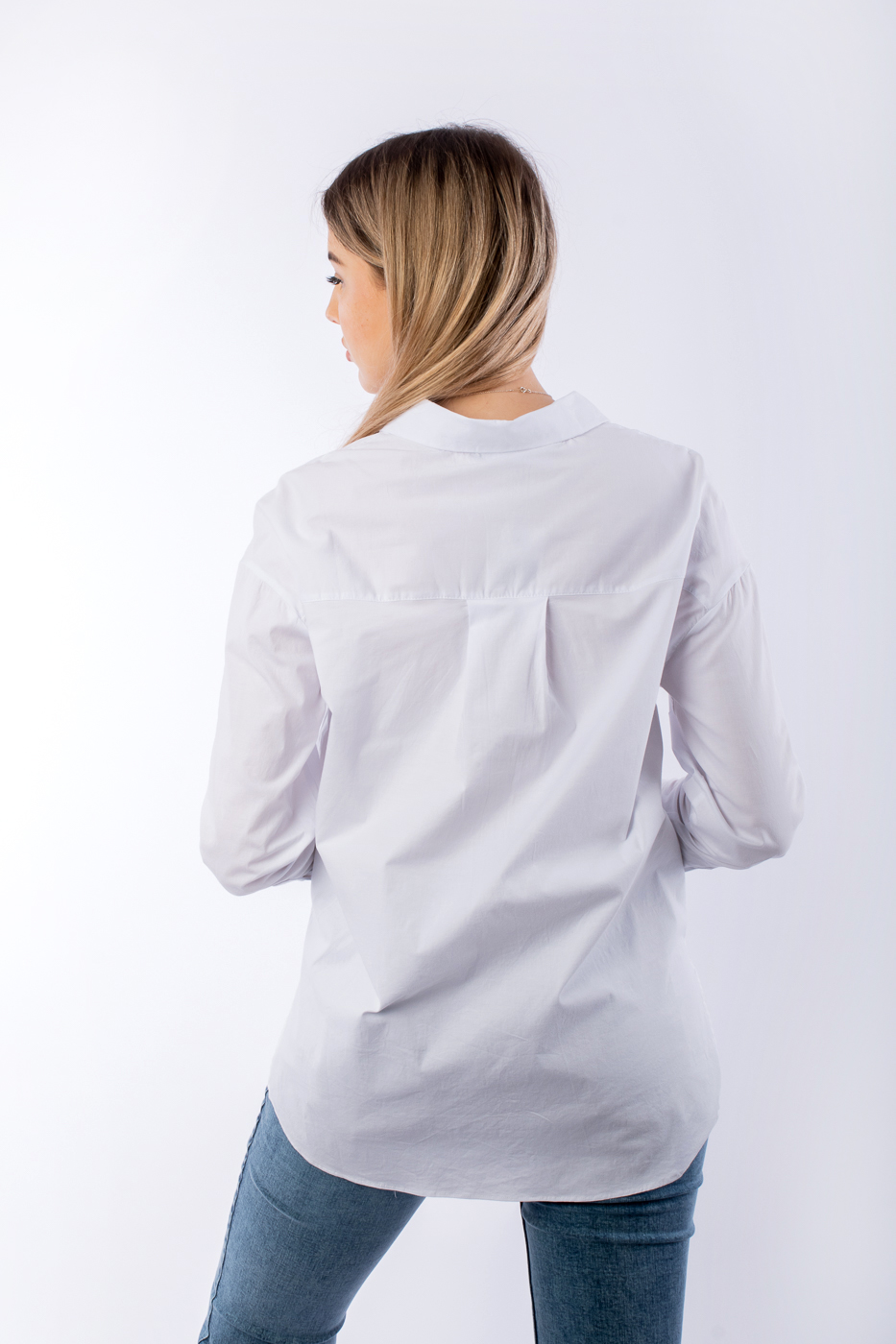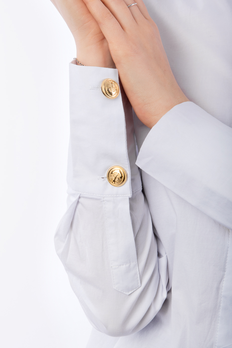 Ця модель з напівкруглим низом. Кругла горловина доповнена класичним коміром. Пройми опущені, а довгі рукави закінчуються високими манжетами з двома мателевими ґудзиками. На спинці зверху під кокеткою розташовані дві складки. Застібається сорочка спереду повністю на гудзики.