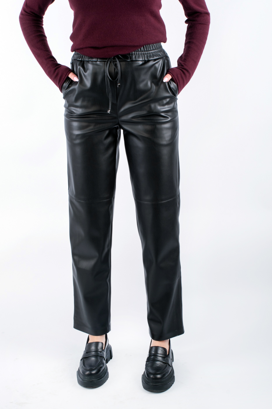 Ці стильні чорні брюки з екошкіри ідеально підходять для створення модного повсякденного образу цієї осені. Вони мають високу посадку і йдуть в комплекті з поясом, що додає зручності та підкреслює вашу фігуру. Однотонний дизайн робить їх універсальними і легкими для поєднання з іншими предметами гардеробу. Regular fit забезпечує комфорт, а штани на завʼязках додають оригінальності та функціональності. Відмінний вибір для стильних жінок, які цінують комфорт і модний вигляд.