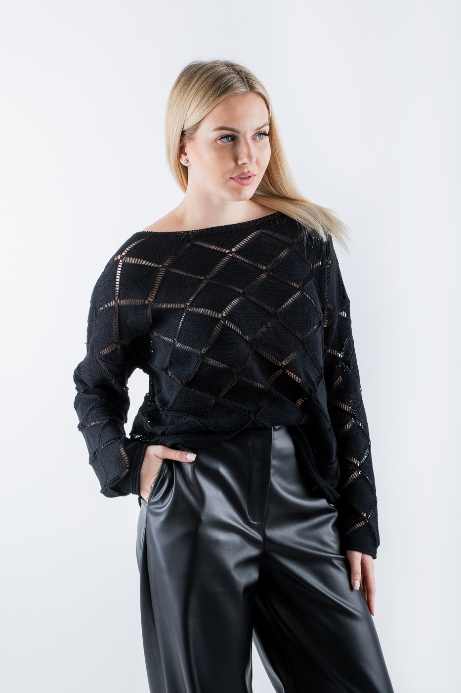 Цей стильний чорний джемпер складається з якісного трикотажу і підходить для повсякденного носіння. Жіночний та зручний, він ідеально доповнить ваш гардероб. Цей джемпер має ажурну в'язку, яка додає йому елегантності та створює додаткову глибину чорного кольору. Це чудовий вибір на демісезон, коли потрібно зігріти й сховатися від прохолоди, але ще не потрібно носити важкі верхи. Цей джемпер стане найулюбленішим предметом вашого гардеробу завдяки своїй привабливій зовнішності та зручності.