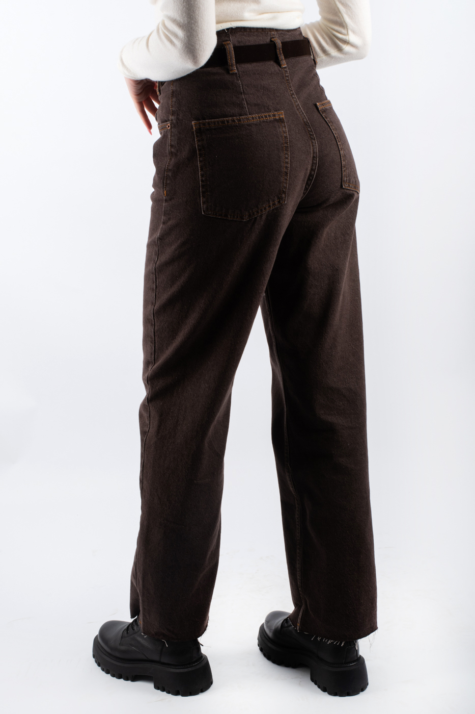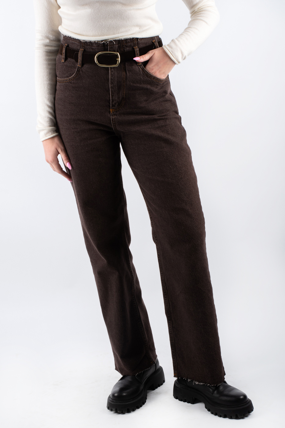Жіночі джинси коричневого кольору - ідеальний вибір для створення стильного повсякденного образу. Вони виготовлені з якісного джинсу, що забезпечує комфорт та довговічність носіння в будь-який сезон. Завдяки високій посадці та прямому крою regular fit, джинси підкреслять вашу фігуру, а необроблений край додає модного акценту. Ця однотонна модель доповнена ременем, який додає завершеності вашому образу та робить його більш витонченим. Ідеально підходять для будь-яких повсякденних ситуацій, ці джинси стануть універсальним елементом вашого гардеробу.