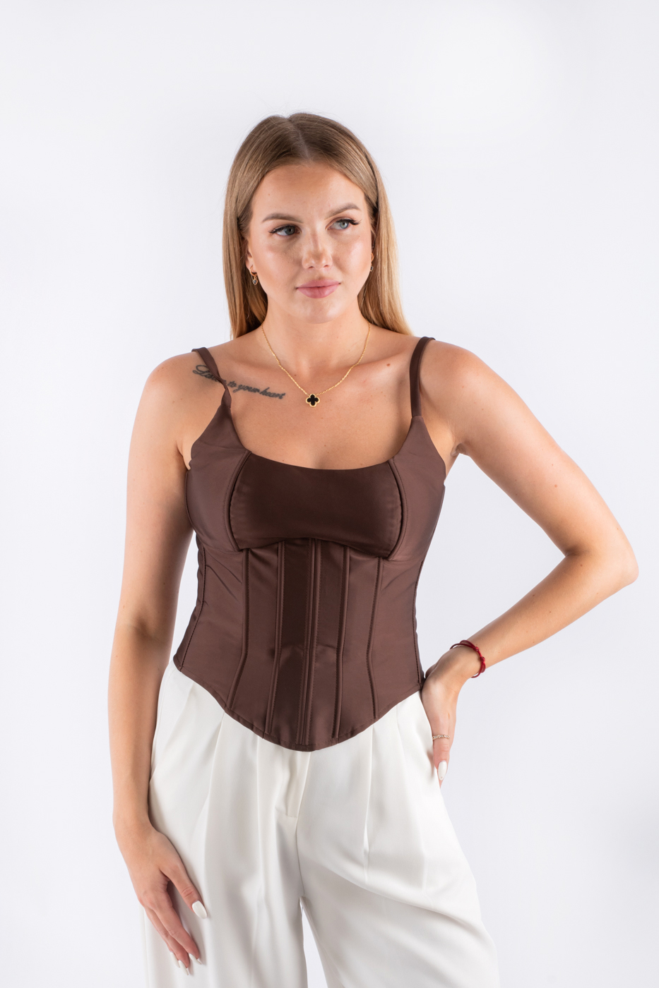 Відкрийте для себе вишуканість із нашим жіночим корсетом бюстьє на бретелях, виконаним у розкішному коричневому кольорі. Цей святковий елемент гардероба стане ідеальним вибором для особливих подій або вечірніх виходів. Виготовлений з високоякісного атласу, корсет забезпечує однотонний та елегантний вигляд, що підкреслить вашу індивідуальність. Завдяки всесезонному дизайну, цей корсет можна носити протягом усього року, поєднуючи з іншими предметами гардероба для створення модних і стильних образів. Додайте нотку вишуканості до свого гардероба з цим неперевершеним жіночим корсетом бюстьє!