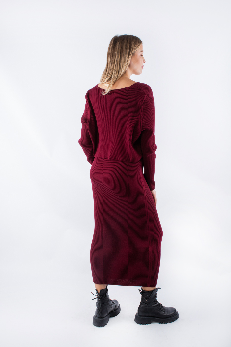 102244 Костюм вʼязаний зі спідницею та кардиганом бургунді