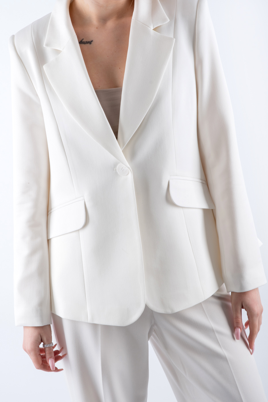 Представляємо вашій увазі білий брючний костюм із нашої ексклюзивної колекції жіночого одягу, ідеальний вибір для створення стильного повсякденного образу. Цей класичний брючний костюм виконаний з високоякісної костюмної тканини, яка забезпечує комфорт і елегантність в будь-яку пору року. Однотонний дизайн акцентує увагу на витонченій простоті та додасть впевненості вашій появі. Незалежно від того, чи ви йдете на роботу, чи на зустріч з друзями, цей всесезонний жіночий костюм стане незамінною частиною вашого гардеробу. Обирайте стиль і якість разом з нами.