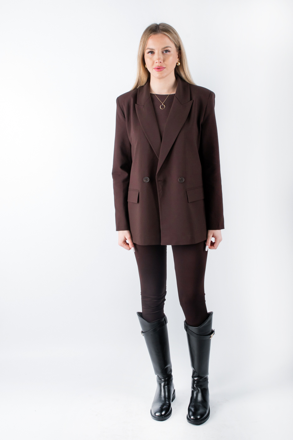 Представляємо вашій увазі класичний двобортний жіночий піджак коричневого кольору, який стане ідеальним доповненням до вашого гардеробу. Цей піджак є втіленням елегантності та стриманого стилю, відмінною рисою якого є однотонний дизайн. Виготовлений з високоякісної костюмної тканини, він підходить для всесезонного носіння, забезпечуючи комфорт та стиль у будь-яку пору року. Прямий крій цього піджака дозволяє легко комбінувати його з різноманітними елементами жіночого одягу, додаючи нотку вишуканості до щоденного образу. Ідеальний вибір для створення повсякденного, але при цьому стильного вигляду на будь-який випадок.