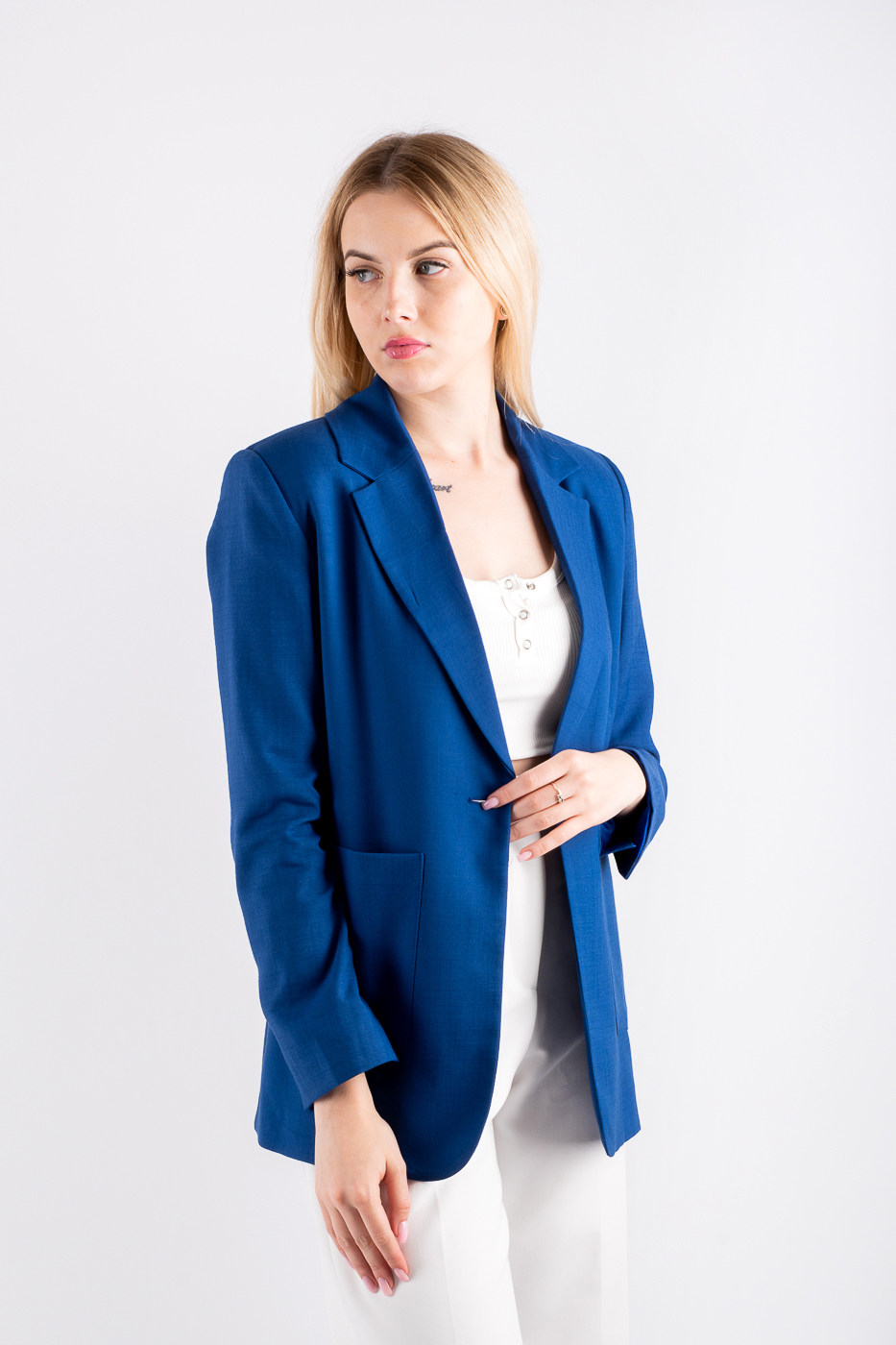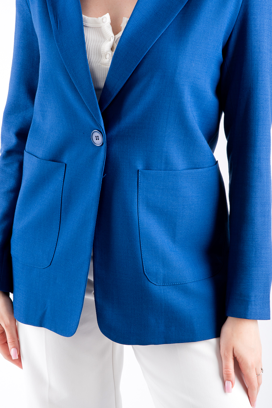 Класичний жакет з підкладкою, коміром і нашивками у вигляді накладних кишень.