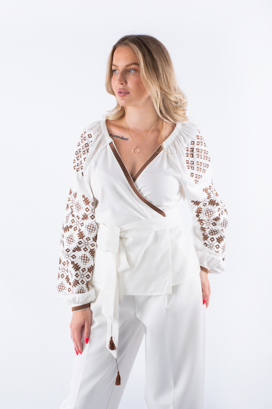 Елегантна жіноча сорочка в етно-casual стилі стане чудовим доповненням вашого гардеробу. Виготовлена з якісних матеріалів — бавовни та поліестеру, ця вишиванка забезпечує комфорт на кожен день та підходить для всесезонного носіння. Однотонний молочний колір із вишуканим коричневим оздобленням додає витонченості та підкреслює ваш унікальний стиль. Ідеальний вибір для створення модного образу, що поєднує в собі традиційні мотиви та сучасну естетику.