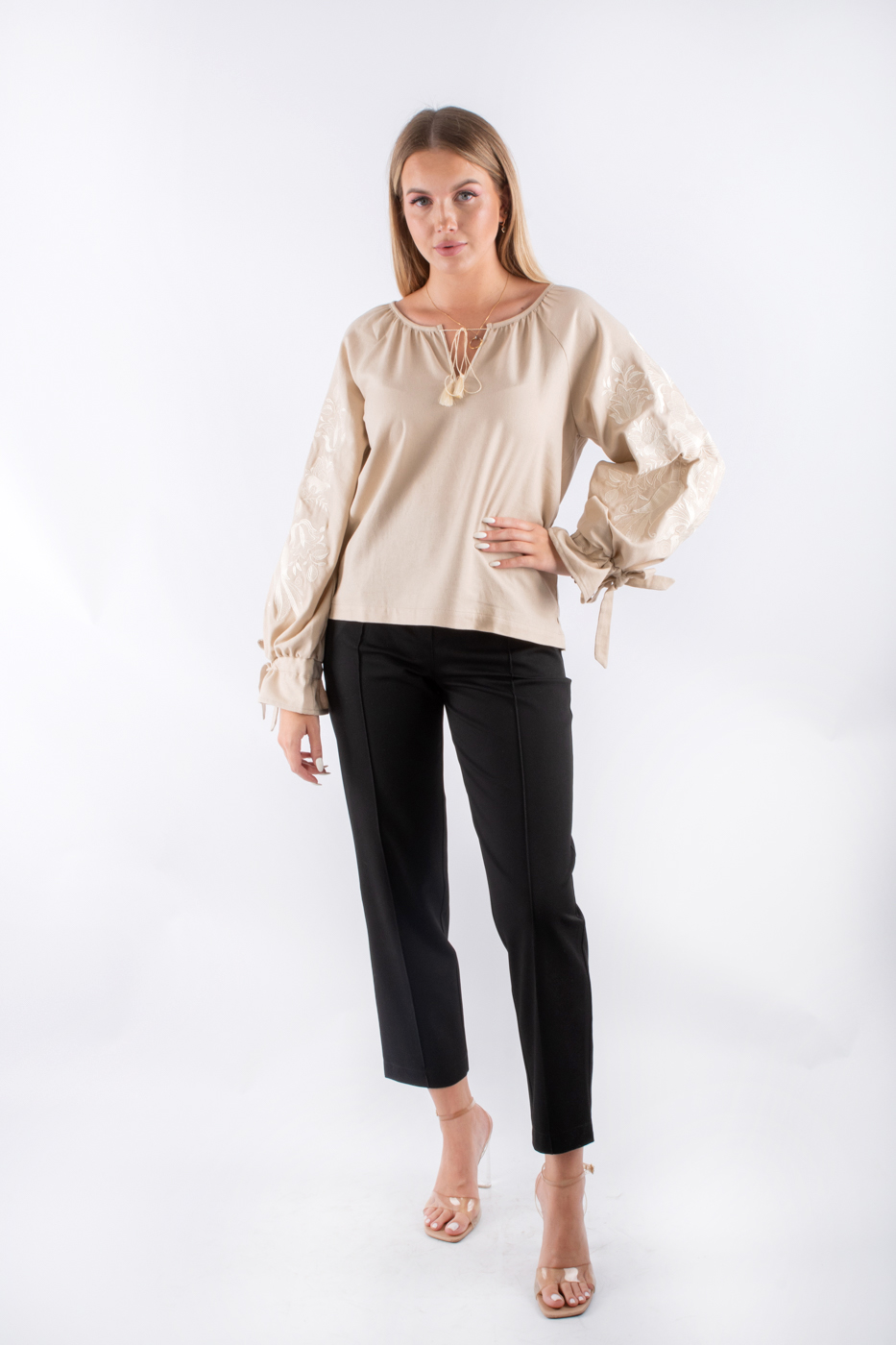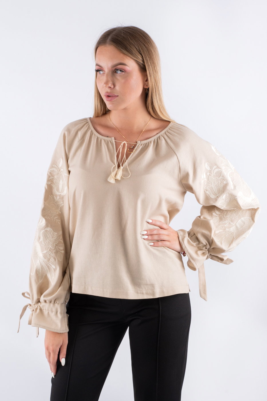 35177 Сорочка вишиванка з завʼязками на рукавах темно-бежева