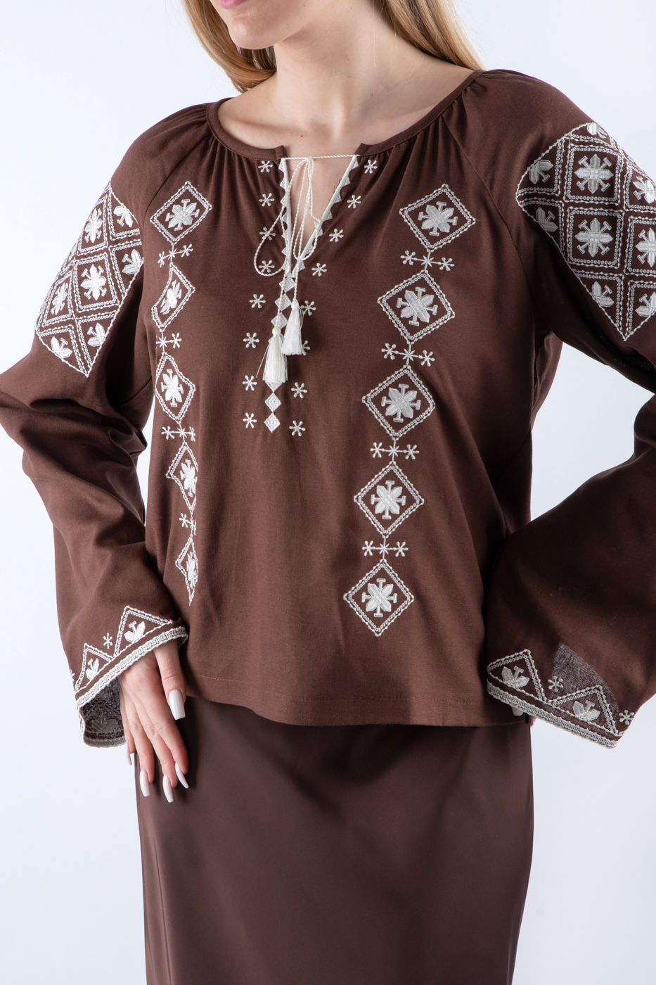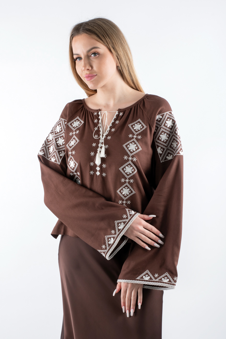 35516 Сорочка вишиванка з широкими рукавами коричнева з молочним оздобленням