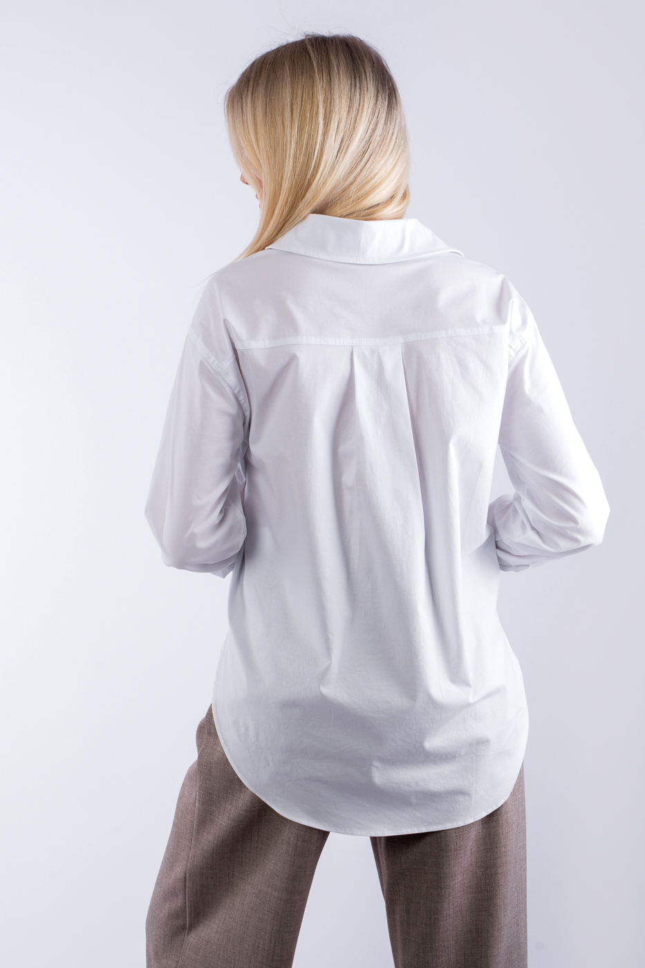 Ця модель з напівкруглим низом. Кругла горловина доповнена класичним коміром. Пройми опущені, а довгі рукави закінчуються високими манжетами з двома ґудзиками. На спинці зверху під кокеткою розташовані дві складки. Зліва на грудях пришита накладна кишеня. Застібається сорочка спереду повністю на гудзики.