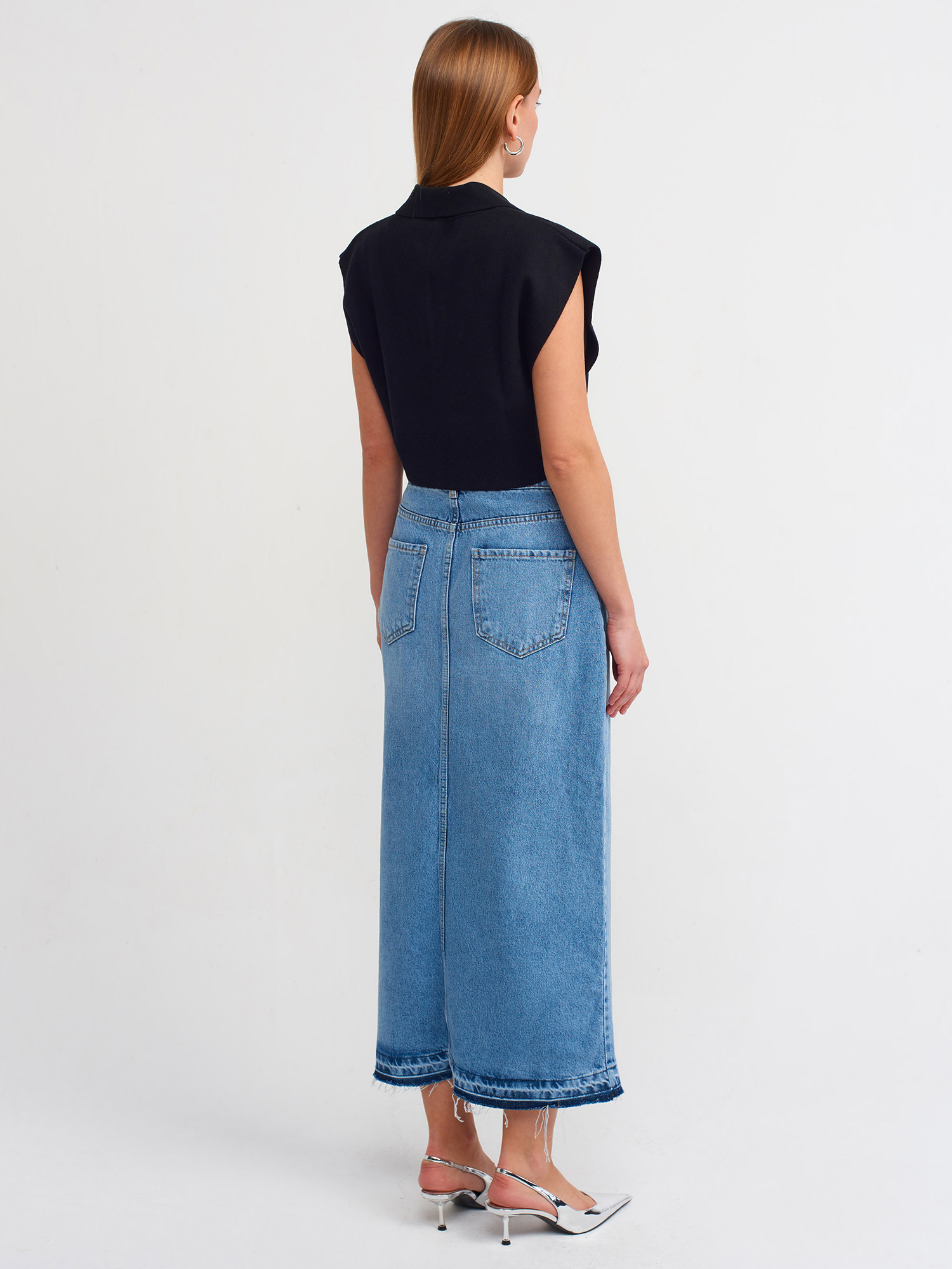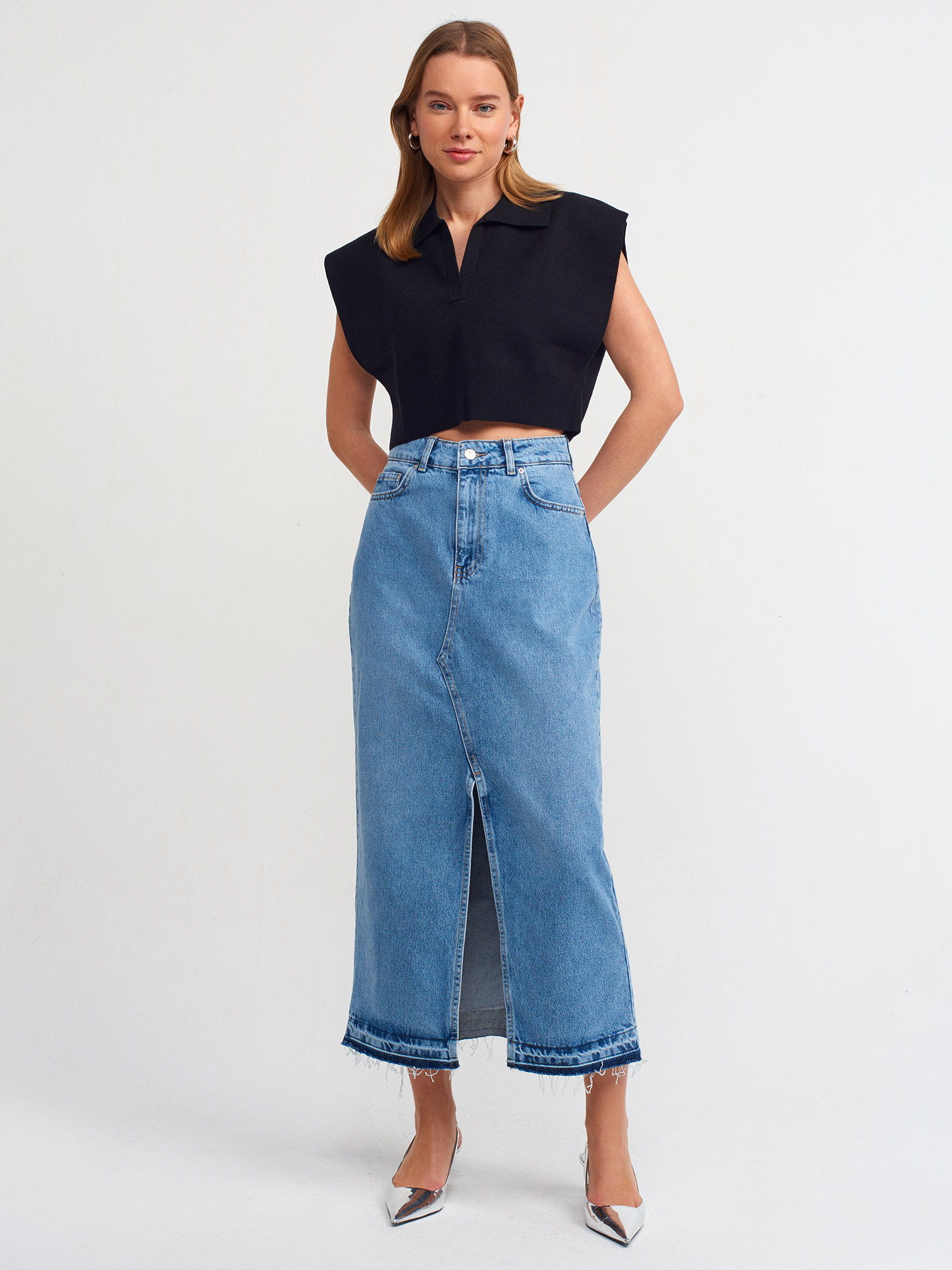 У моделі края низу прямі не оброблені, декоративний шов, розташований спереду по центру. По цетру присутній розріз. Втачний пояс без резинки всередині, з петлями для ременя. Спереду спідниця застібається на металевий гудзик і на блискавку, а також доповнена прорізними кишеньками. Ззаду вгорі є кокетка, під якою пришиті накладні кишені, а по центру декоративний вертикальний шов.