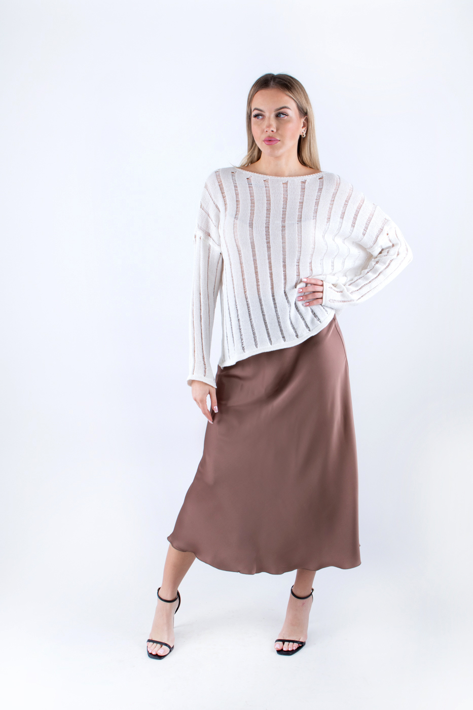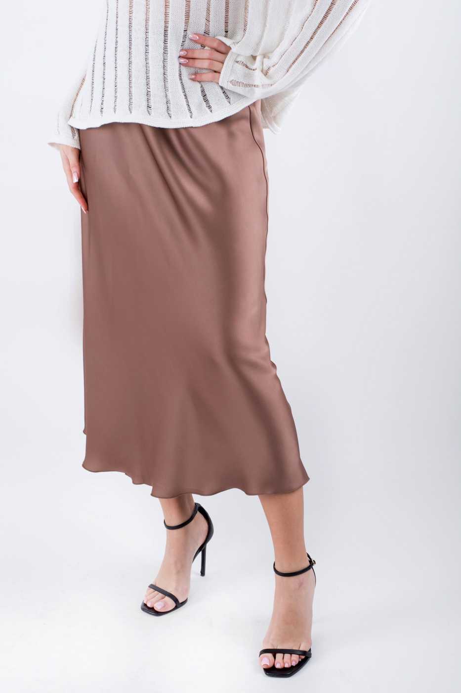 Представляємо вам жіночу коричневу спідницю міді в білизняному стилі, яка стане ідеальним доповненням вашого повсякденного гардеробу. Виготовлена з високоякісного шовку, ця однотонна спідниця забезпечує комфорт і вільний крій, що підходить для демісезонного носіння. Її стильний білизняний дизайн робить цю річ універсальною, дозволяючи легко комбінувати з різними блузами та топами для створення неперевершених образів. Оновіть свій модний арсенал цією елегантною спідницею, яка підкреслить ваш бездоганний смак та індивідуальність.
