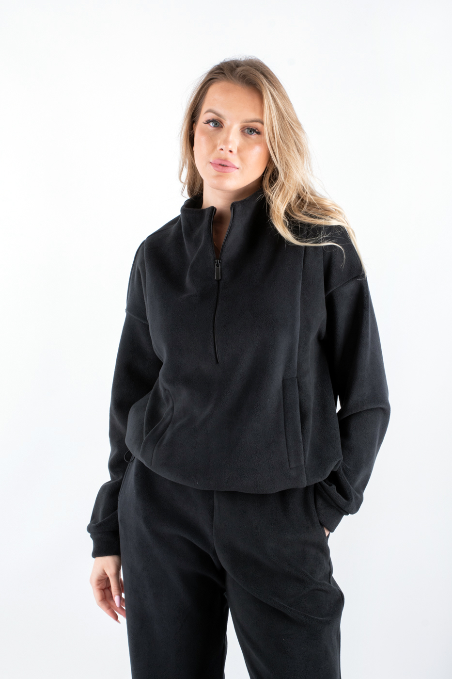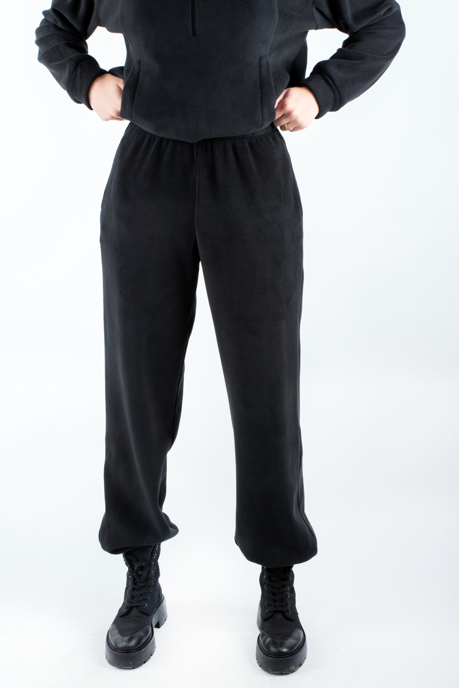 Цей жіночий спортивний костюм - ідеальний вибір для осені. Представлений в універсальному чорному кольорі, він підкреслить вашу індивідуальність і стиль навіть у найпрохолодніші дні. Утеплений флісом, костюм забезпечує комфорт і тепло, що робить його незамінним в осінньому гардеробі. Однотонний дизайн підкреслює елегантність і лаконічність спортивного стилю. Практичність і комфорт цього костюма роблять його ідеальним вибором для активного відпочинку або повсякденних прогулянок. Відчуйте свободу рухів і затишок одночасно з нашим чорним спортивним костюмом.