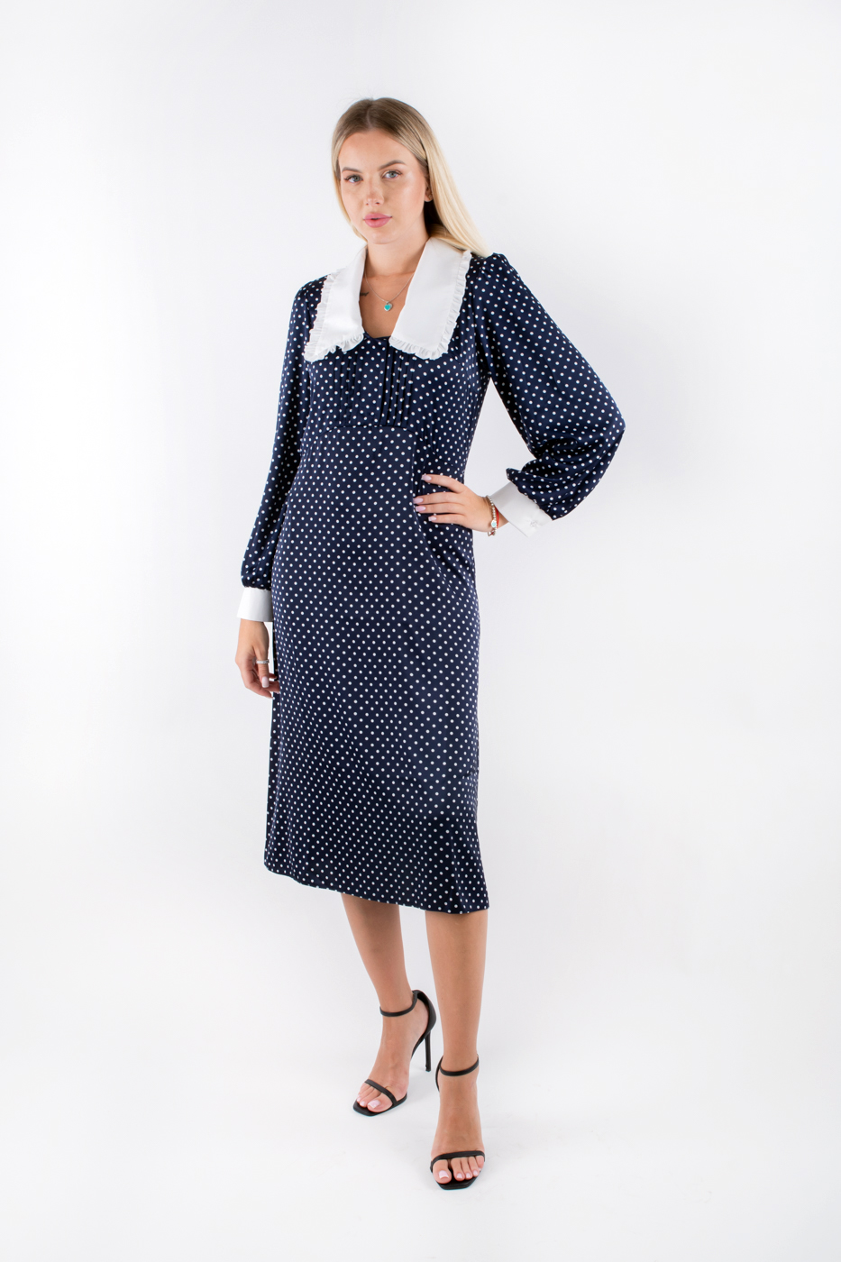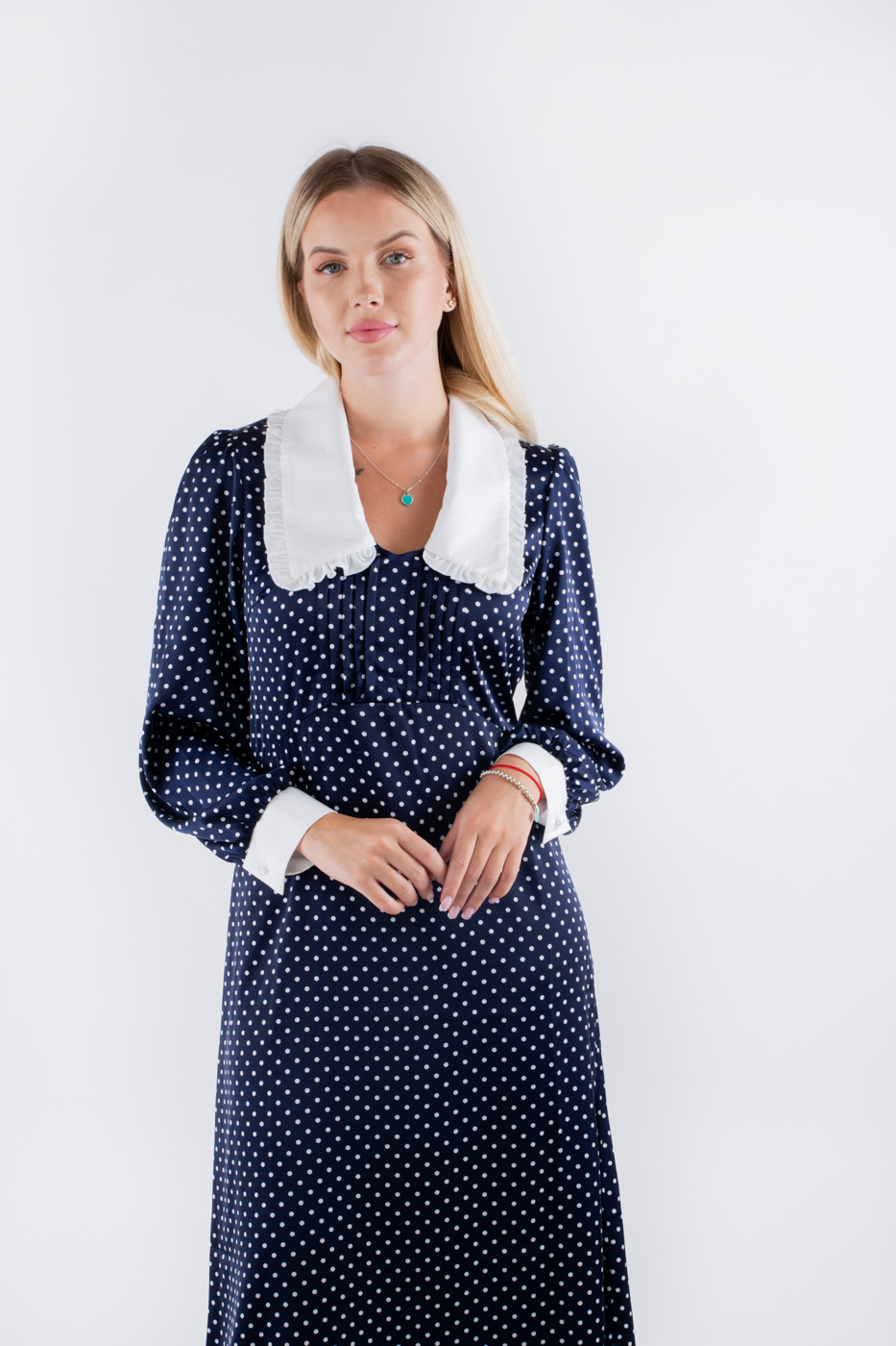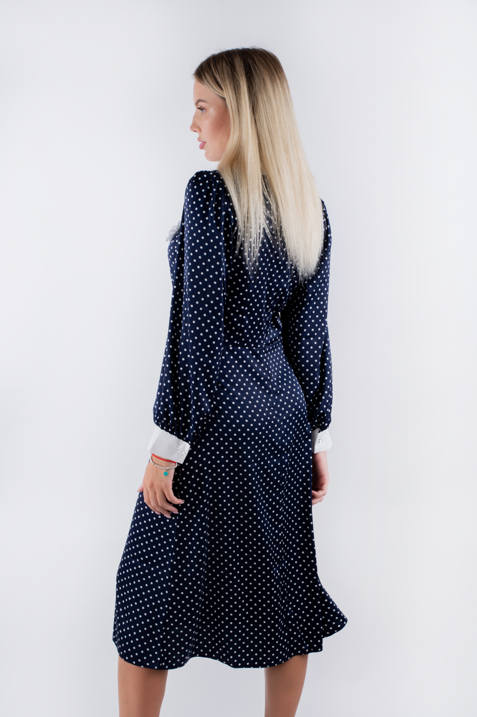 Купити жіночу однотонну сукню в темно-синьому кольорі для повсякденного носіння (casual) на весну/літо з приталеним силуетом. Виготовлена з віскози. Актуальний дизайн - сукня міді в горошок відповідає всім трендам сезону.