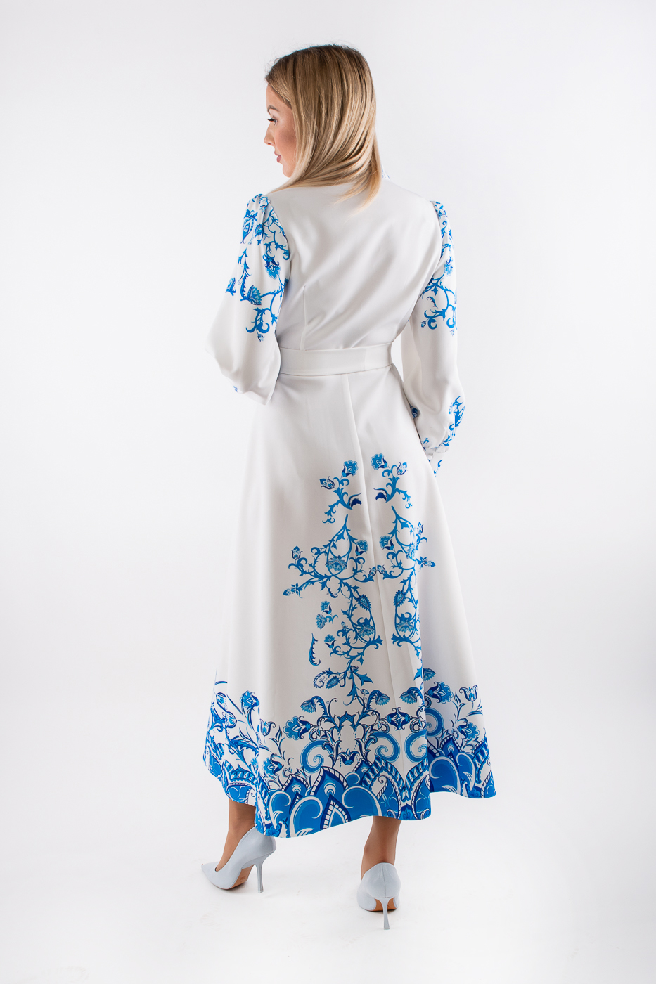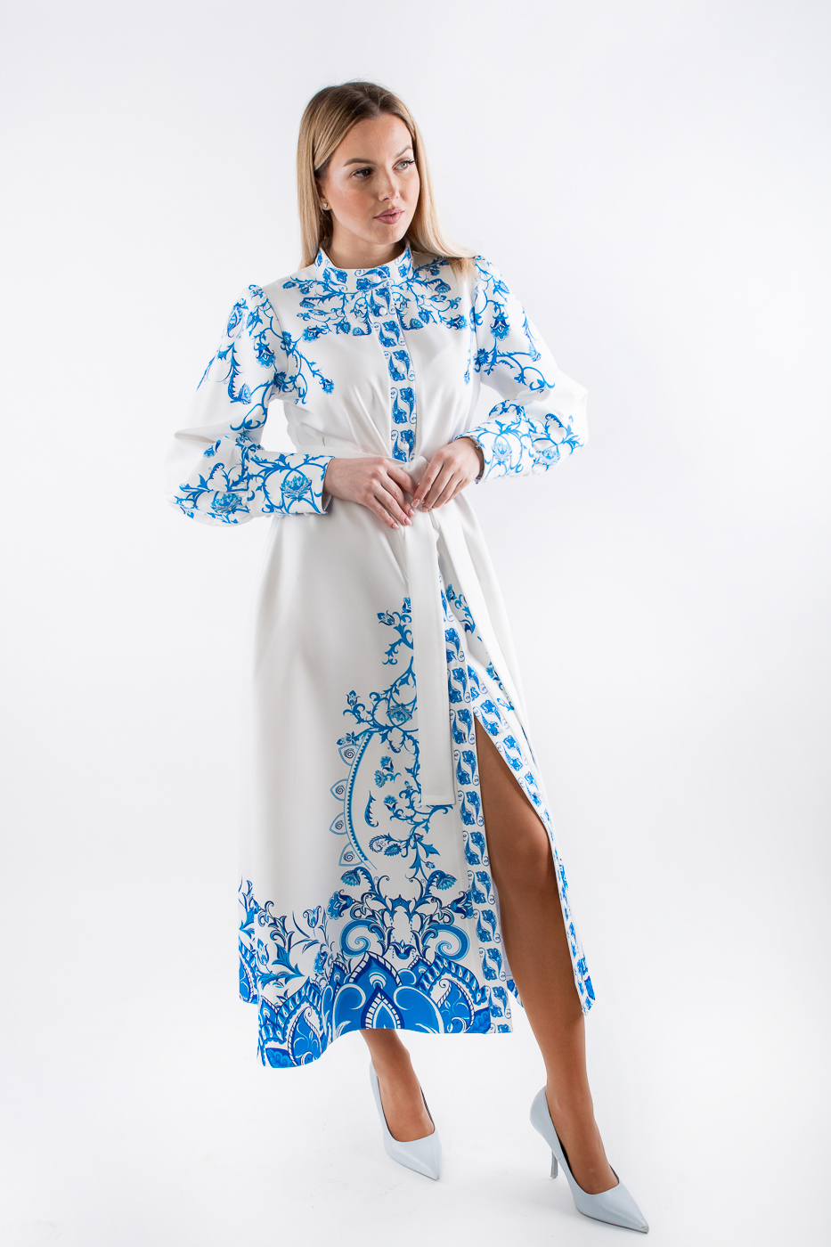 83375-1 Сукня з принтом та поясом біло-блакитна