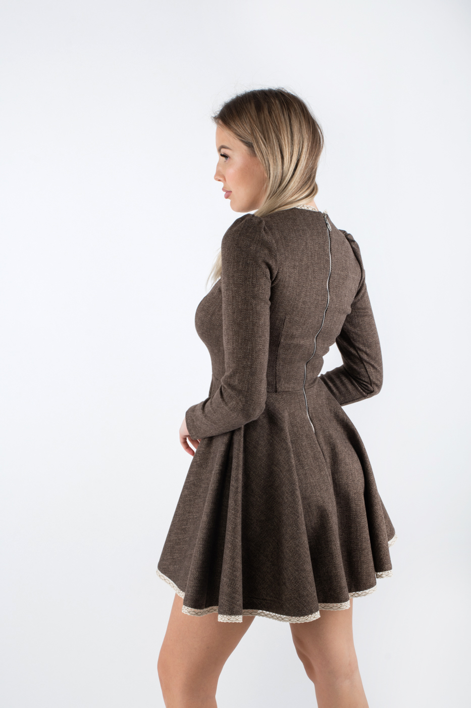 83446 Плаття міні декороване ґудзиками з мереживом коричневе