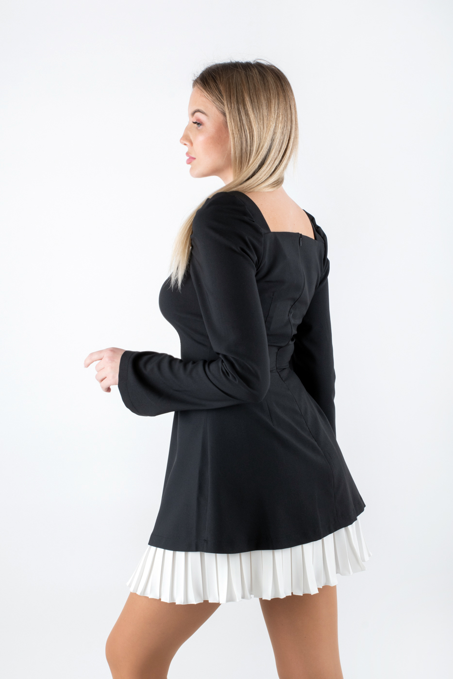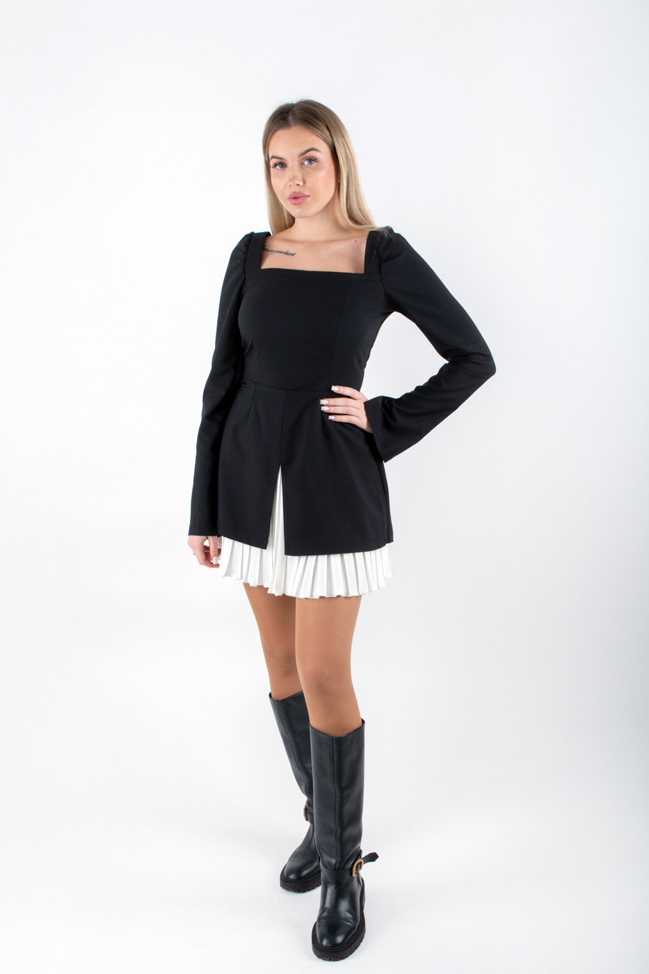 Представляємо стильну жіночу сукню чорного кольору, яка стане незамінною частиною вашого демісезонного гардеробу. Ця однотонна міні-сукня виготовлена з якісної костюмної тканини, що забезпечує комфорт і довговічність, ідеально підійде для повсякденного носіння. Прямий крій та елегантний розріз посередині додають вишуканості, роблячи ваш образ неперевершеним. Незалежно від ситуації, ця жіноча сукня підкреслить вашу індивідуальність та стиль, перетворюючи щоденні виходи на модні дефіле.