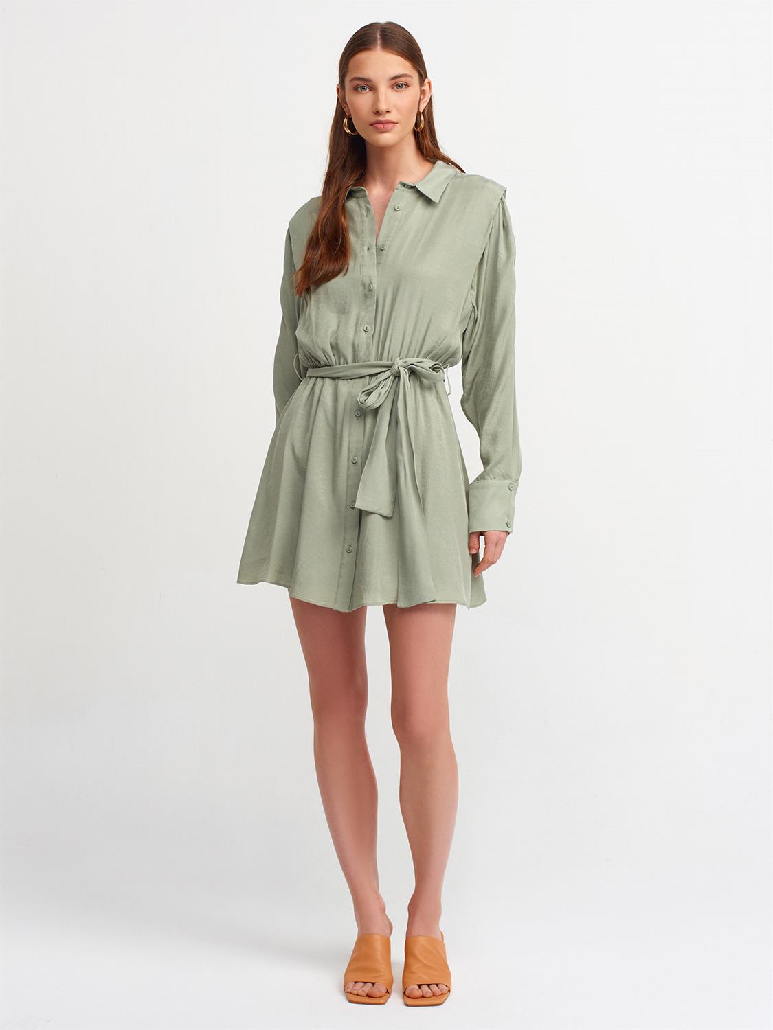 Сукня-сорочка м'ятного кольору з гудзиками та поясом. Довжина міні. Вільного крою.