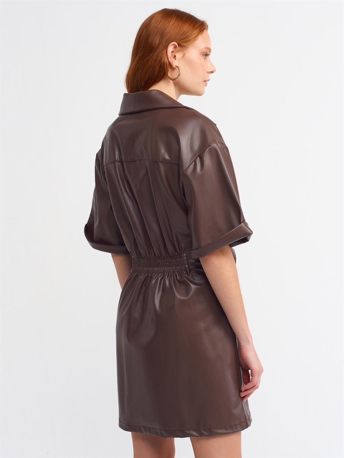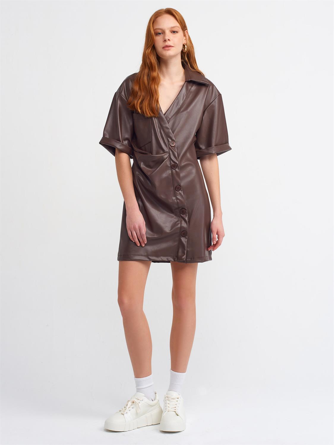 Сукня міні з еко-шкіри коричневого кольору.V-подібний виріз. Короткий рукав реглан. З накладною кишеню з однієї сторони. З коміром. Декоративні гудзики.