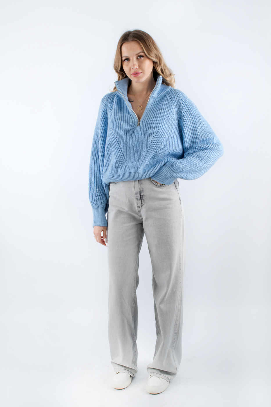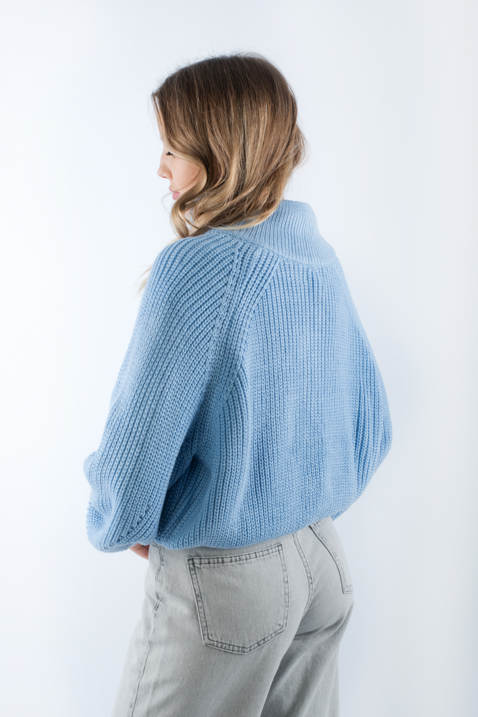 Цей блакитний жіночий светр поло з блискавкою стане ідеальним доповненням вашого повсякденного гардеробу. Виготовлений з високоякісного кашеміру, він забезпечує неймовірний комфорт та тепло в осінній сезон. Вільний крій дозволяє відчувати себе розкуто, а однотонний дизайн додає ніжності та елегантності. Светр чудово поєднується з будь-якими джинсами або спідницями, що робить його універсальним вибором для кожної модниці, яка цінує стиль та зручність.