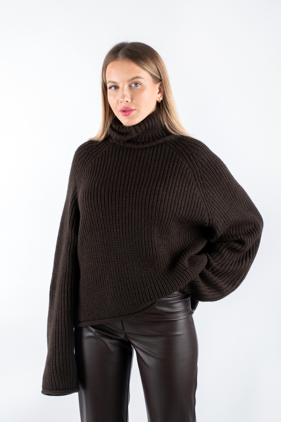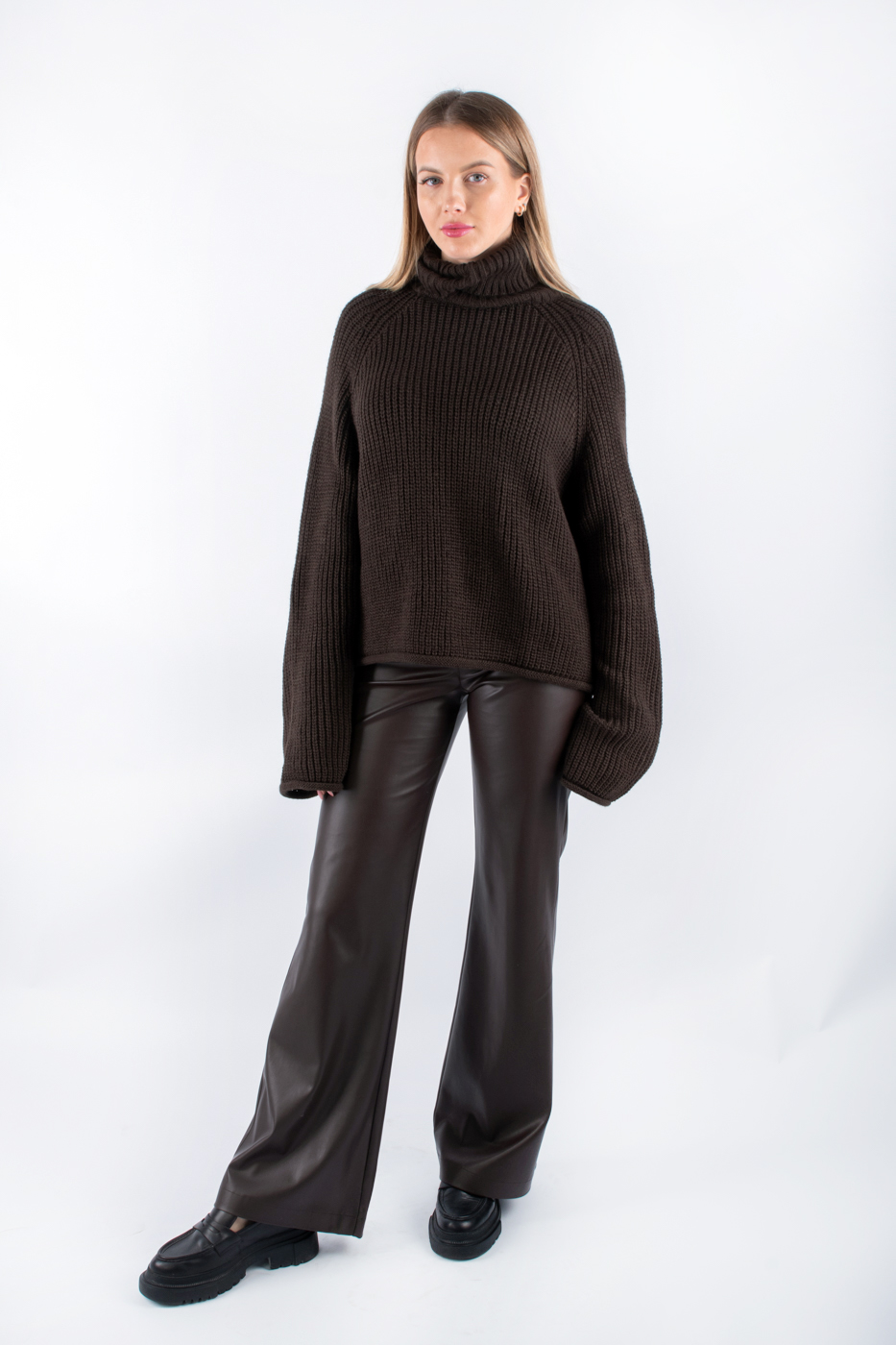 102365 Светр вʼязаний з горловиною шоколадний