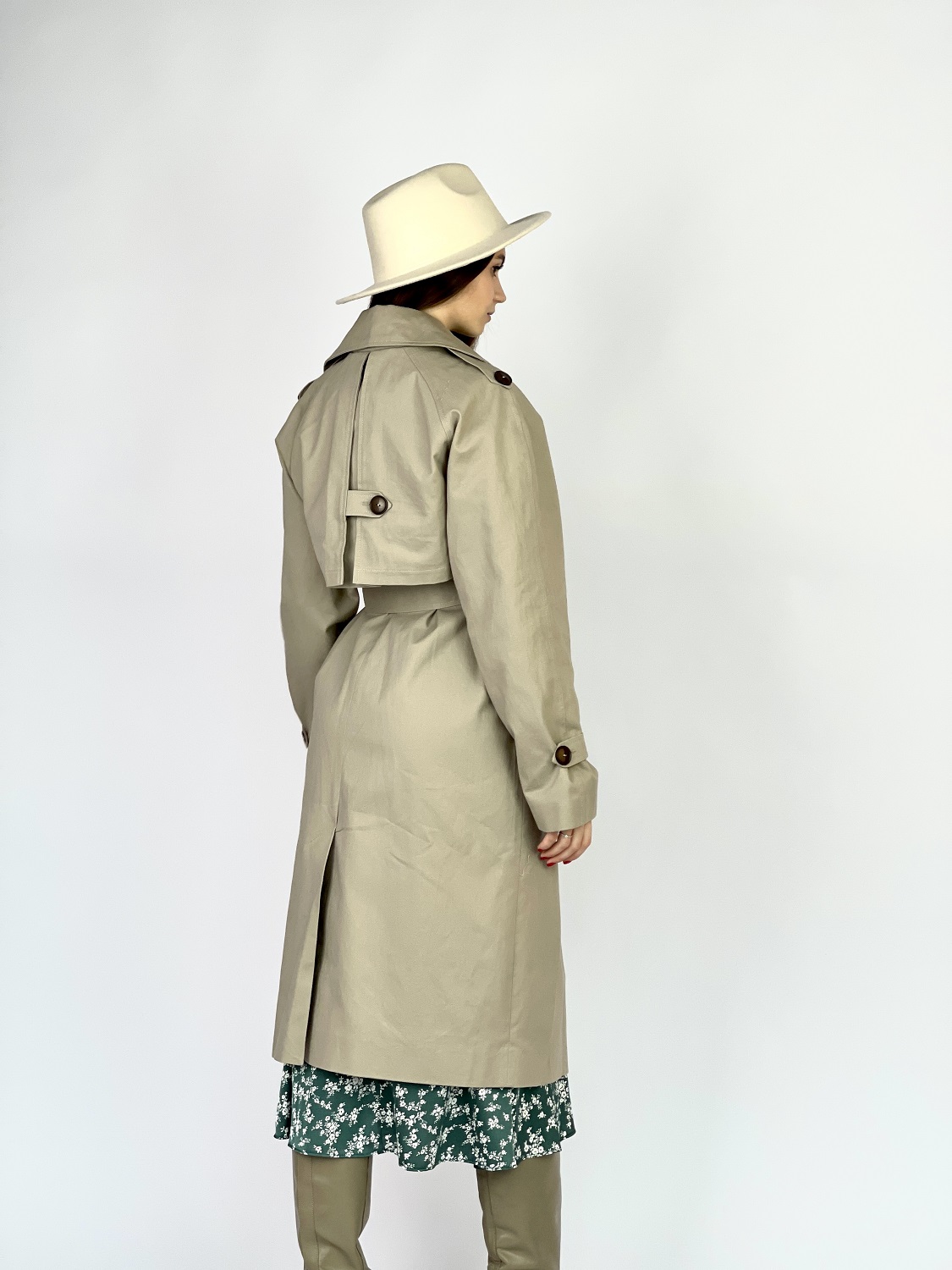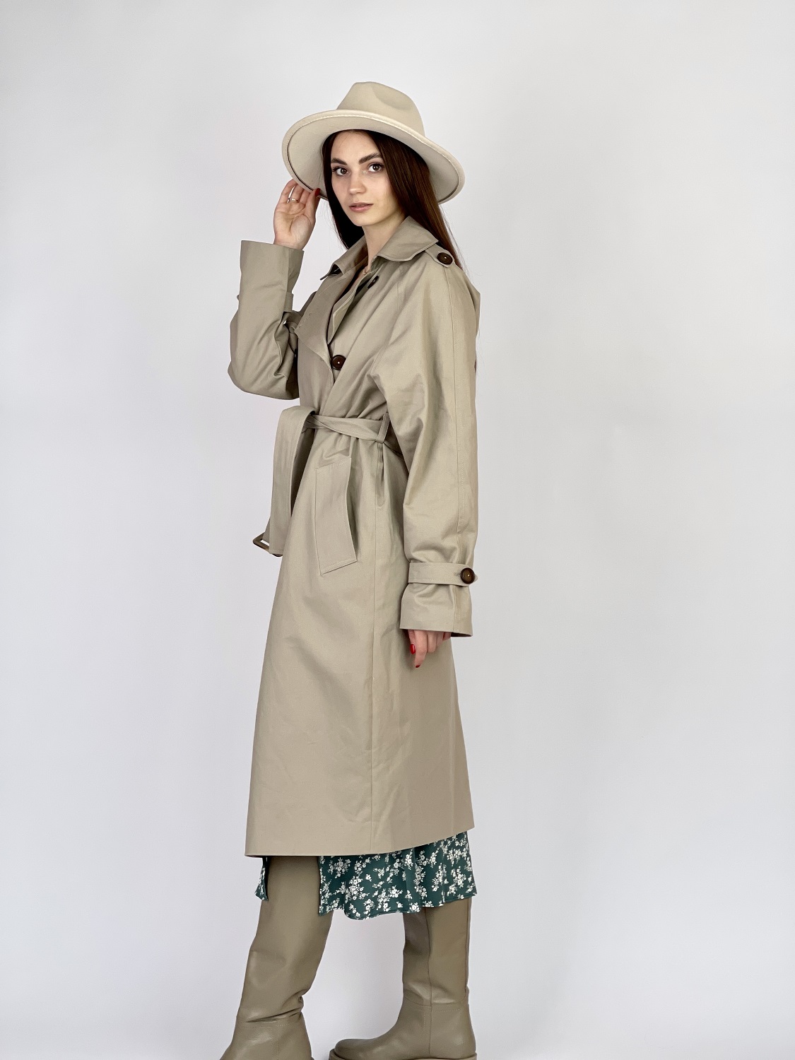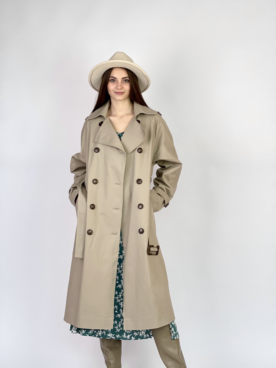 Тренч прямого крою з підкладкою, з двобортною застібкою та поясом.